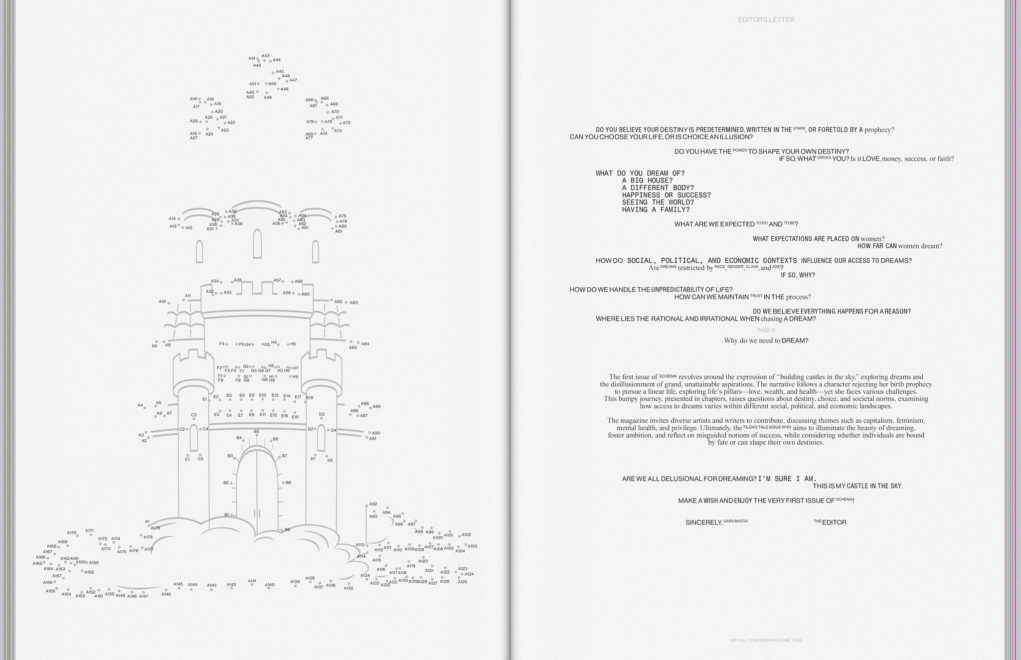The first issue of SCHEMA revolves around the expression of “building castles in the sky,” exploring dreams and the disillusionment of grand, unattainable aspirations. The narrative follows a character rejecting her birth prophecy to pursue a linear life, exploring life’s pillars—love, wealth, and health—yet she faces various challenges. This bumpy journey, presented in chapters, raises questions about destiny, choice, and societal norms, examining how access to dreams varies within different social, political, and economic landscapes.