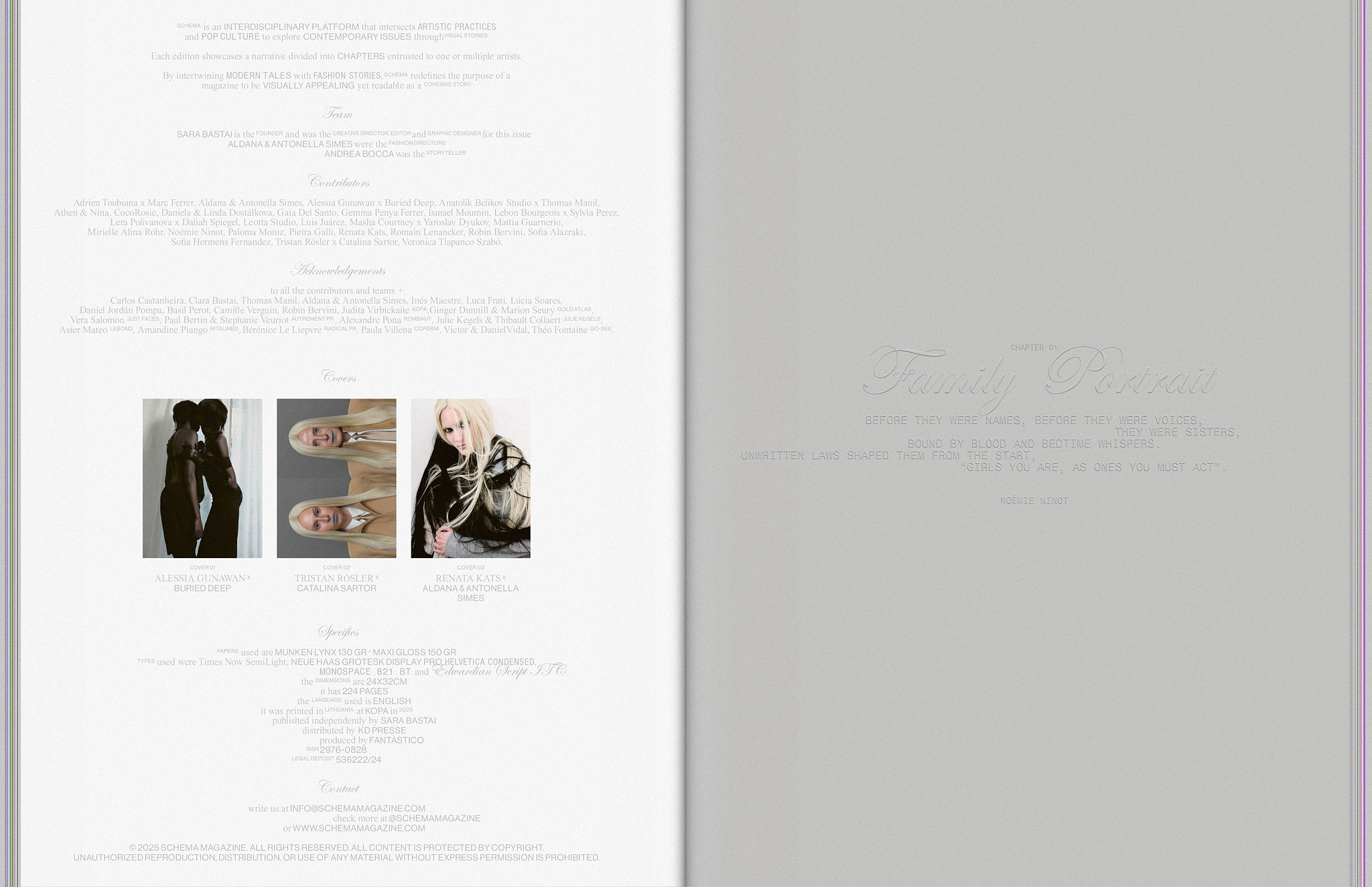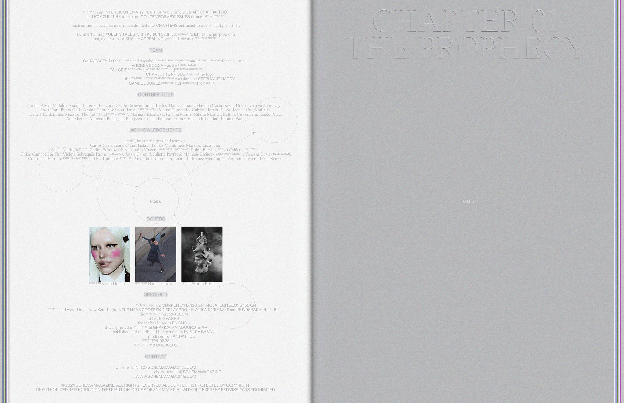 SCHEMA is an interdisciplinary platform that intersects artistic practices and pop culture to explore contemporary issues through visual stories. Each edition showcases a narrative divided into chapters entrusted to one or multiple artists. By intertwining modern tales with fashion stories, SCHEMA redefines the purpose of a magazine to be visually appealing yet readable as a cohesive story.