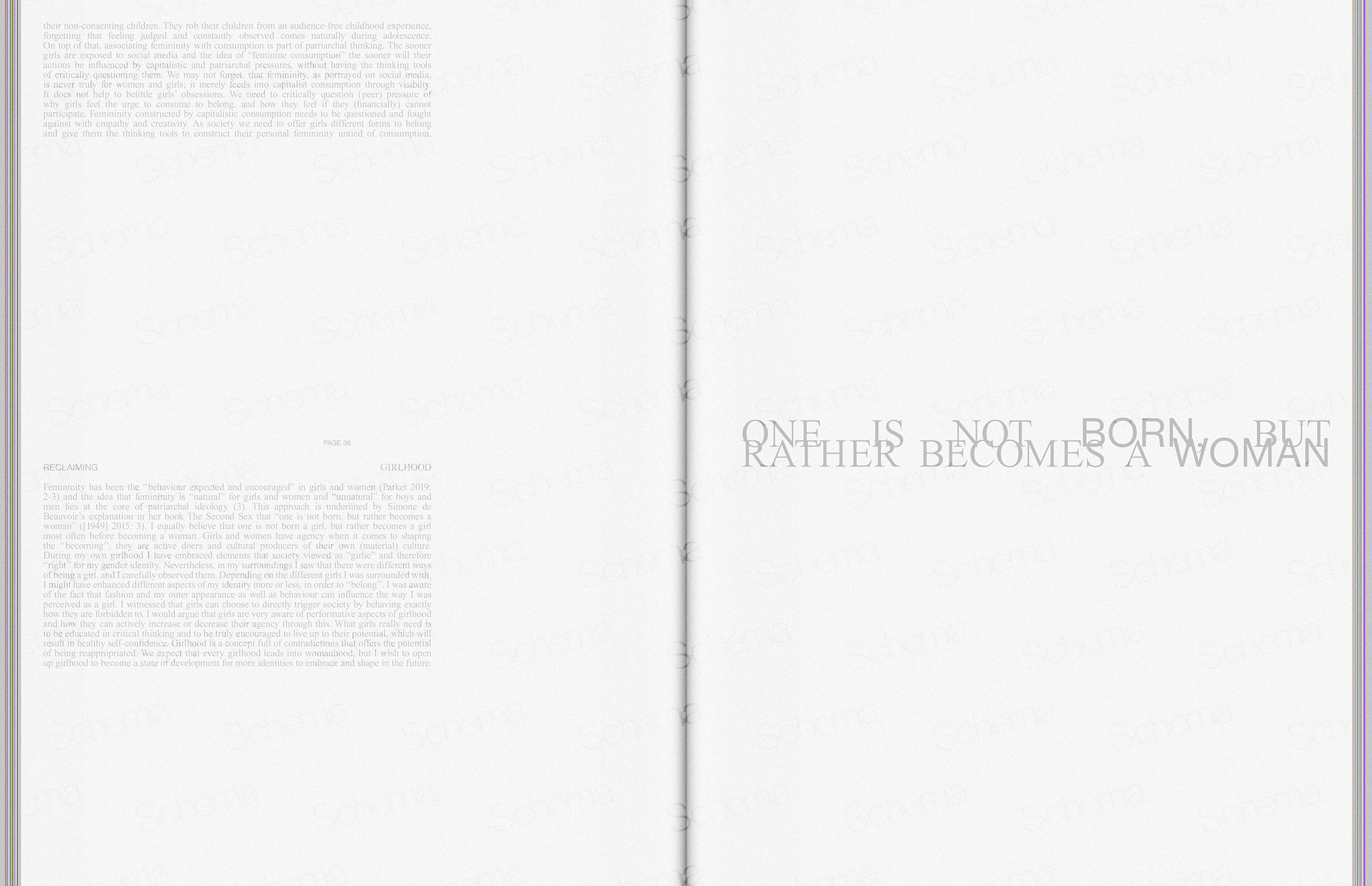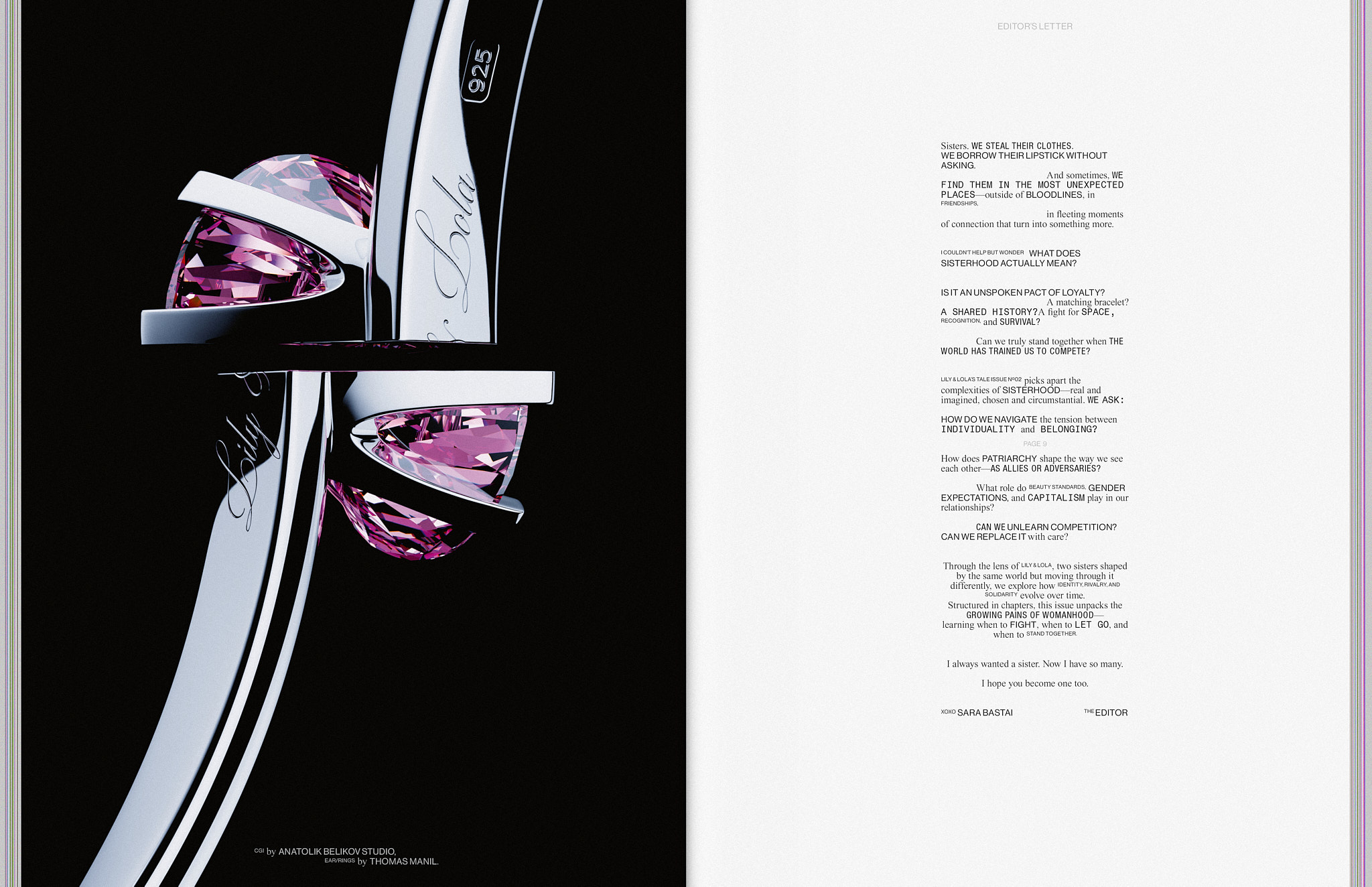 The second issue of SCHEMA delves into the layered world of sisterhood, presenting it as both a personal journey and a collective force. Through the story of two sisters whose shared upbringing gives way to diverging paths, this issue explores how sisterhood is shaped by love, rivalry, societal expectations, and self-discovery. Each chapter unveils a moment in their lives where beauty standards, gender expression, and societal pressures challenge their bond, revealing both the resilience and fragility within sisterhood.